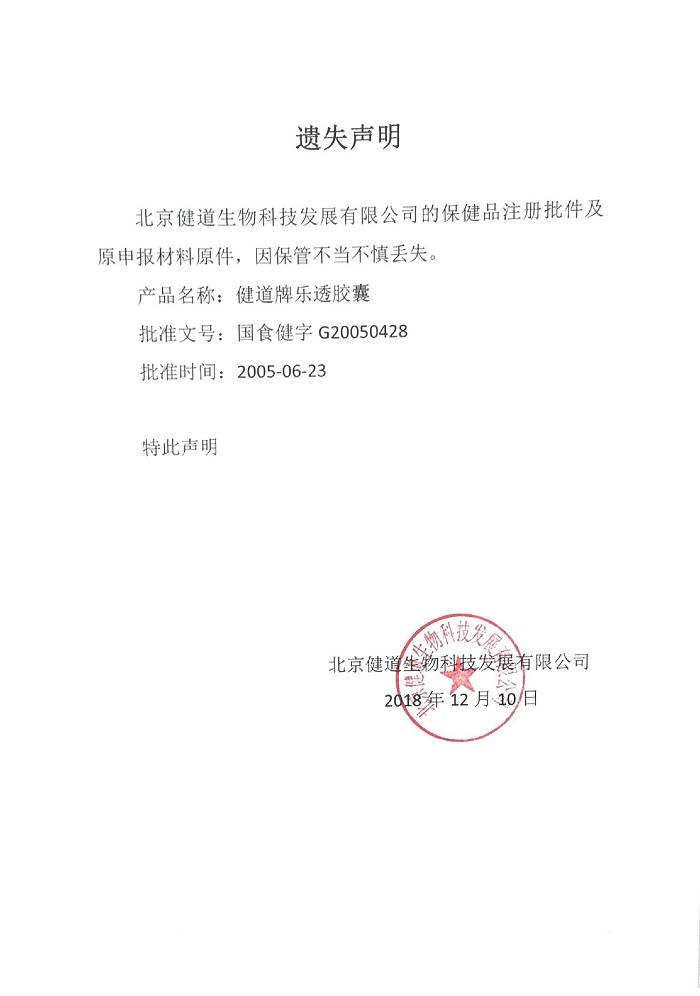 保健食品批准证书遗失声明