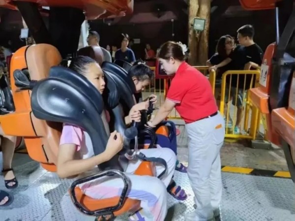 发车前,操作人员会逐个检查乘客的安全带、安全压杠是否系紧、压实,咱们要积极配合检查,确认无误后再发车。