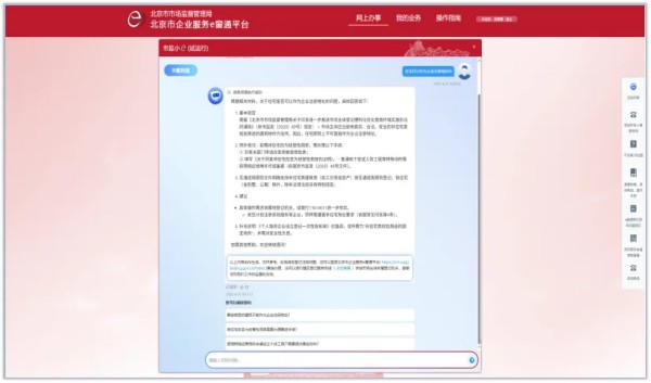 2025年3月,北京市市场监管局企业登记注册场景率先接入AI大模型。通过梳理企业登记政策法规、办事指南、一次性告知单、问答对、专题知识等近3000余条专业知识,构建市场监管政务服务专属模型,实现企业登记注册业务7*24小时在线“智能咨询”服务,打造“能感知、会思考、有温度”的“AI公务员”。