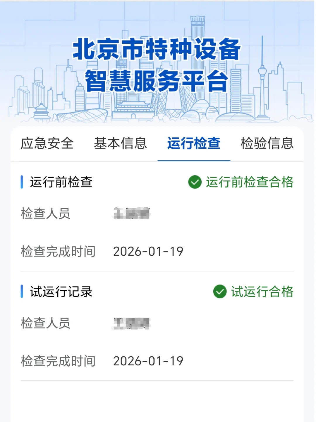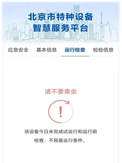 您也可扫描设备“北京市特种设备智慧服务平台”二维码,查询设备的运行前检查和试运行记录。请勿乘坐无证运行、超期未检,或未开展运行前检查及试运行的设备。